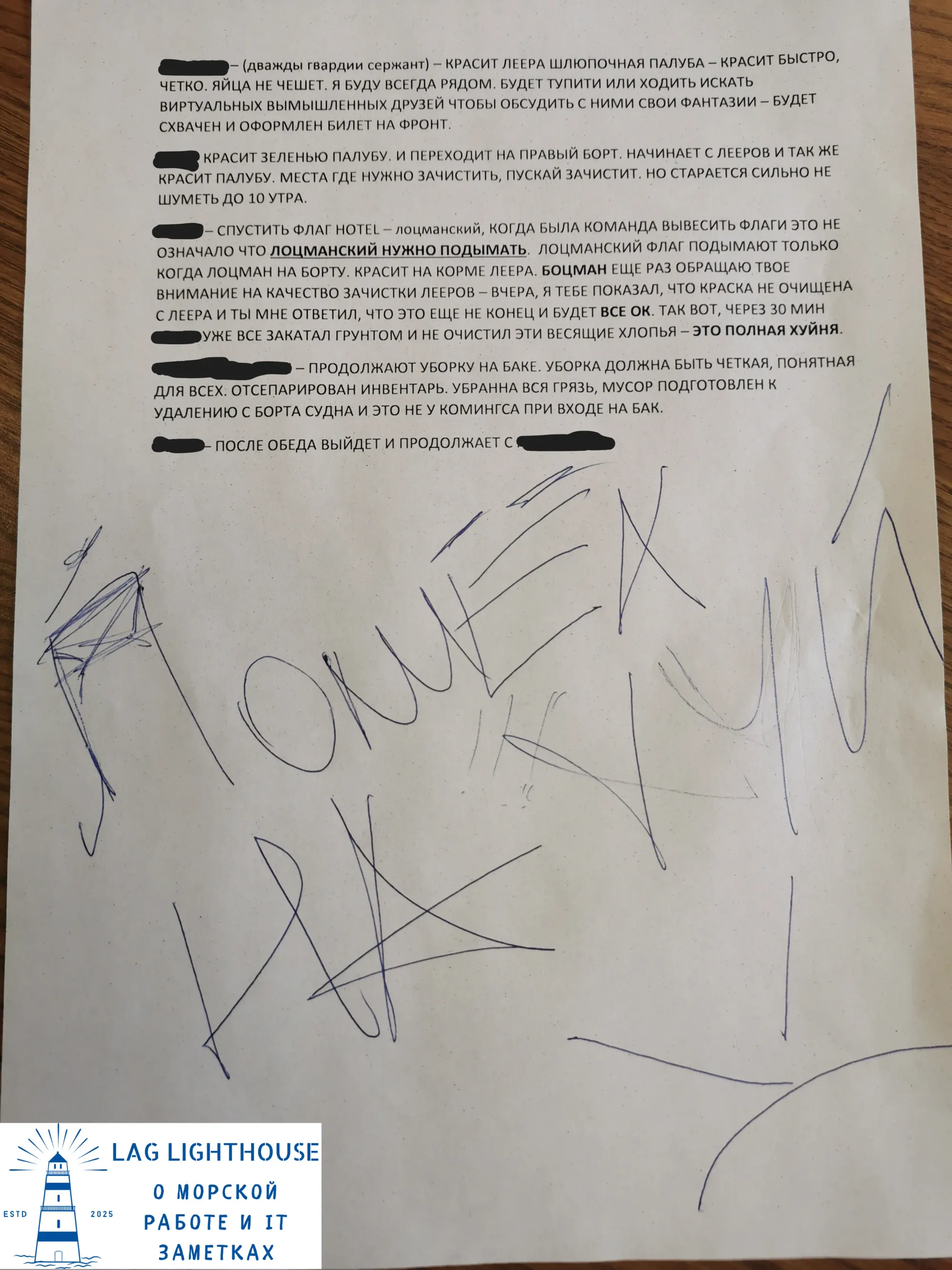 Выше обычный план работы на день. Исходя из фотографии думаю, уже понятно, что один из палубных матросов мягко говоря не соответсвует занимаемой должности...