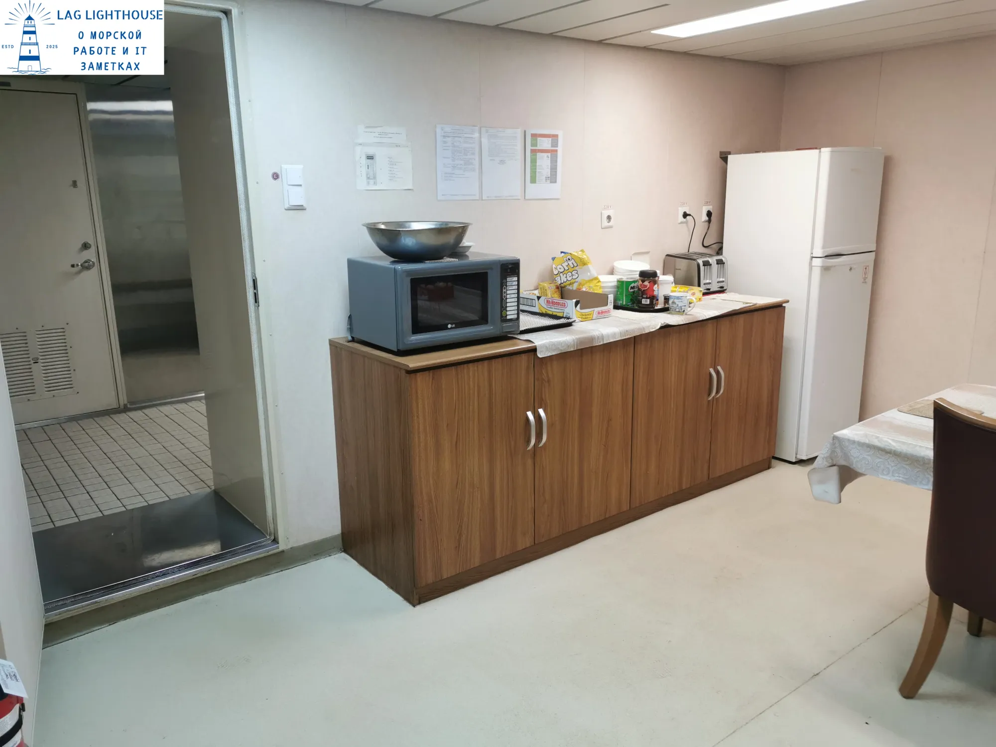 Столовая хоть и небольшая на такое количество человек, но там есть все необходимое, холодильник с едой, микроволновка, тостер, бойлер с кипятком, бич-пакеты всегда были.