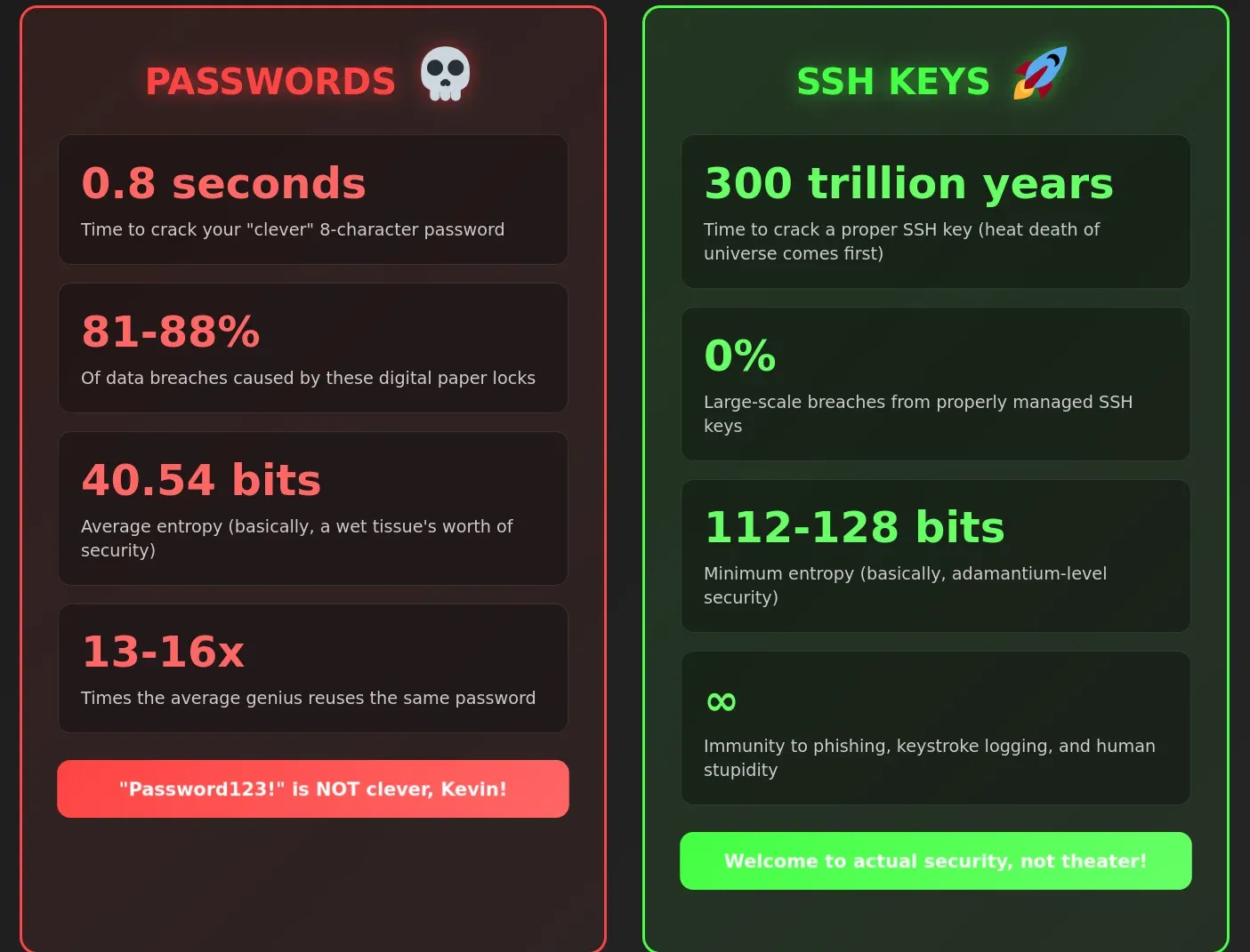 If you're still using passwords for SSH in 2025, you're not just living dangerously - you're playing Russian roulette with a fully loaded gun while standing in a pool of gasoline next to an active volcano. SSH keys aren't just better; they're the difference between actual security and a "Please Hack Me" sign written in neon lights.