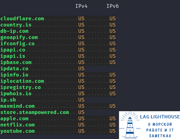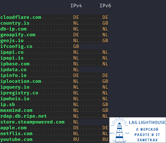 The script queries multiple sources to retrieve the country code associated with your IP, providing a comprehensive overview of how different services interpret your location.